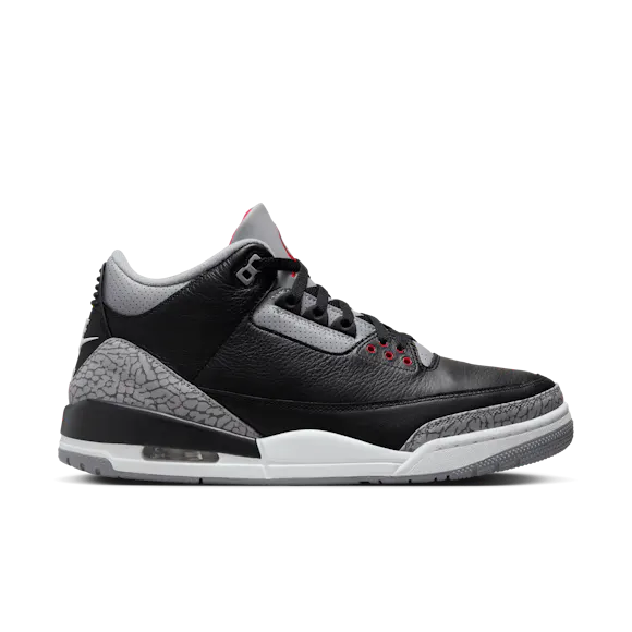 The beloved Air Jordan 3 “Black Cement” is back, returning in its original glory. Remastered with accuracy, showcasing a beautiful colour palette that includes Black, Fire Red, Cement Grey, and Sail, evoking a nostalgic feel. The shoes feature Black tumbled leather, distinctive elephant print overlays, and bold Fire Red accents, making them a trip down memory lane for fans. They are complemented by the beloved "Nike Air" emblem on the heel tabs and the signature Air cushioning in the sole delivers unbeatable comfort. The outsole is made of Cement Grey rubber, maintaining timeless elegance.